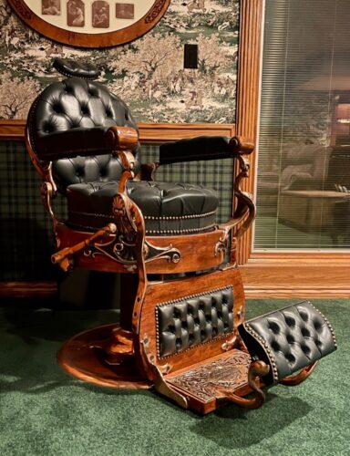 The 1890’s Antique Koken Barber Chair is a rare and highly collectible piece that hails from the Congress Double Round style era. This vintage barber chair is known for its durability and craftsmanship, making it a prized possession for collectors of antique furniture. It has beautiful finished wood, copper metalwork, and banker green tufted leather upholstery. Hydraulics are operational and in good working order. With its unique design and historical significance, this chair is sure to be a standout piece in any collection dedicated to the culture and history of barber shop.